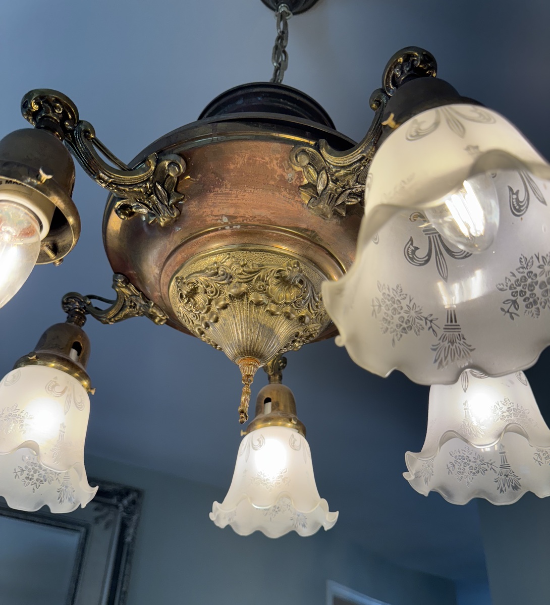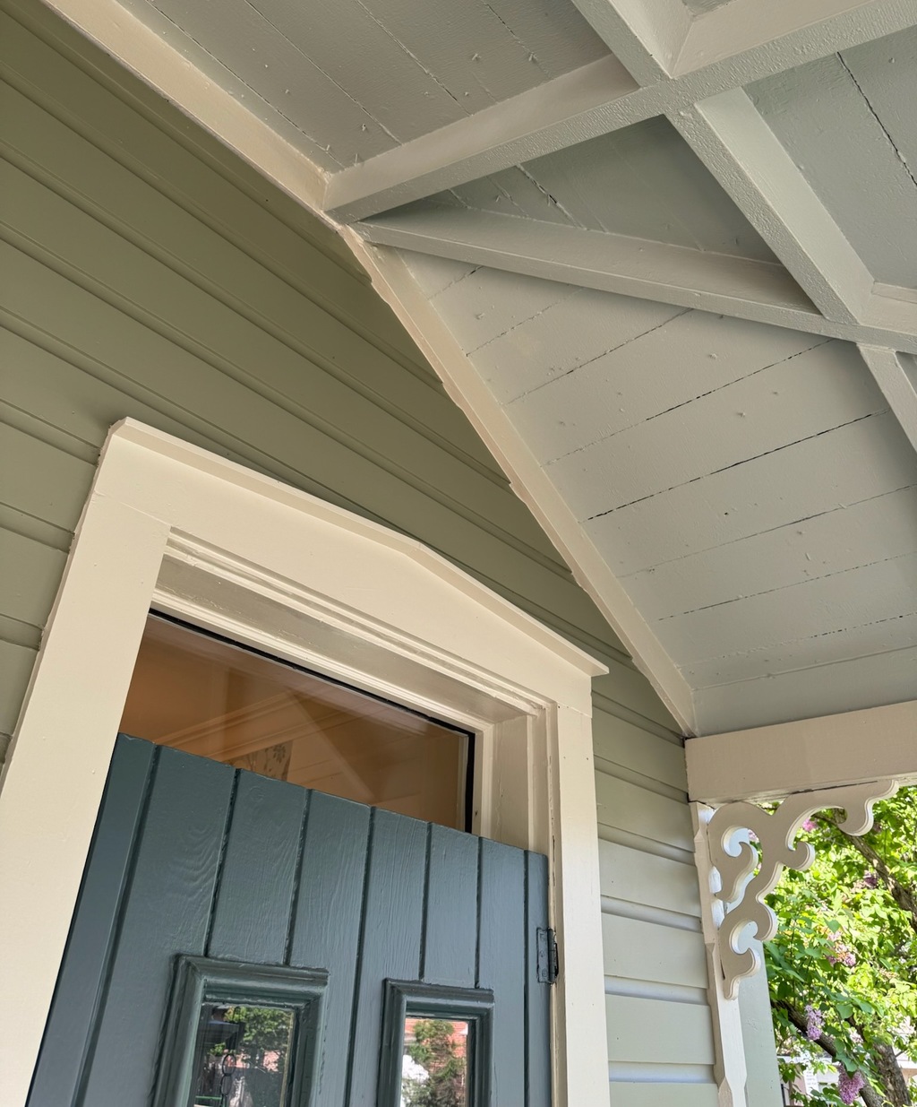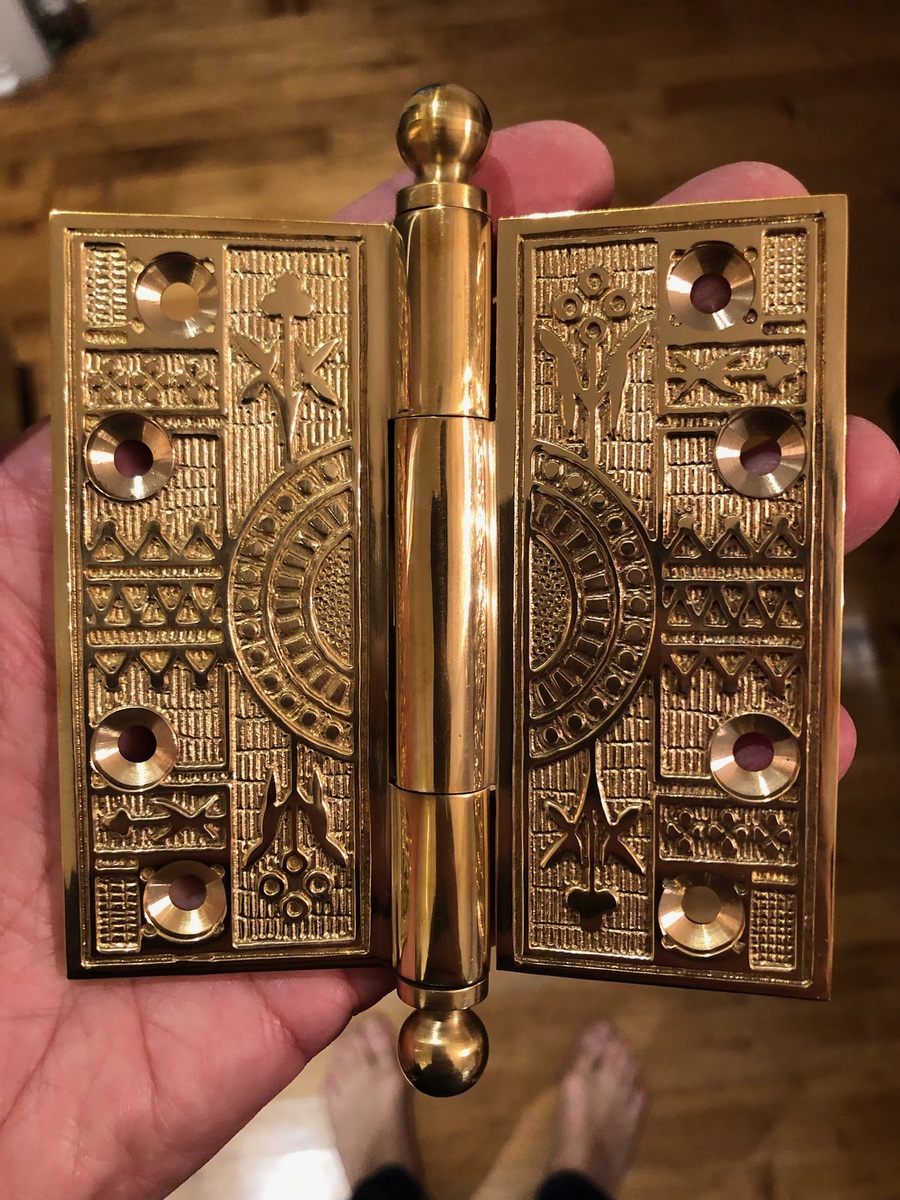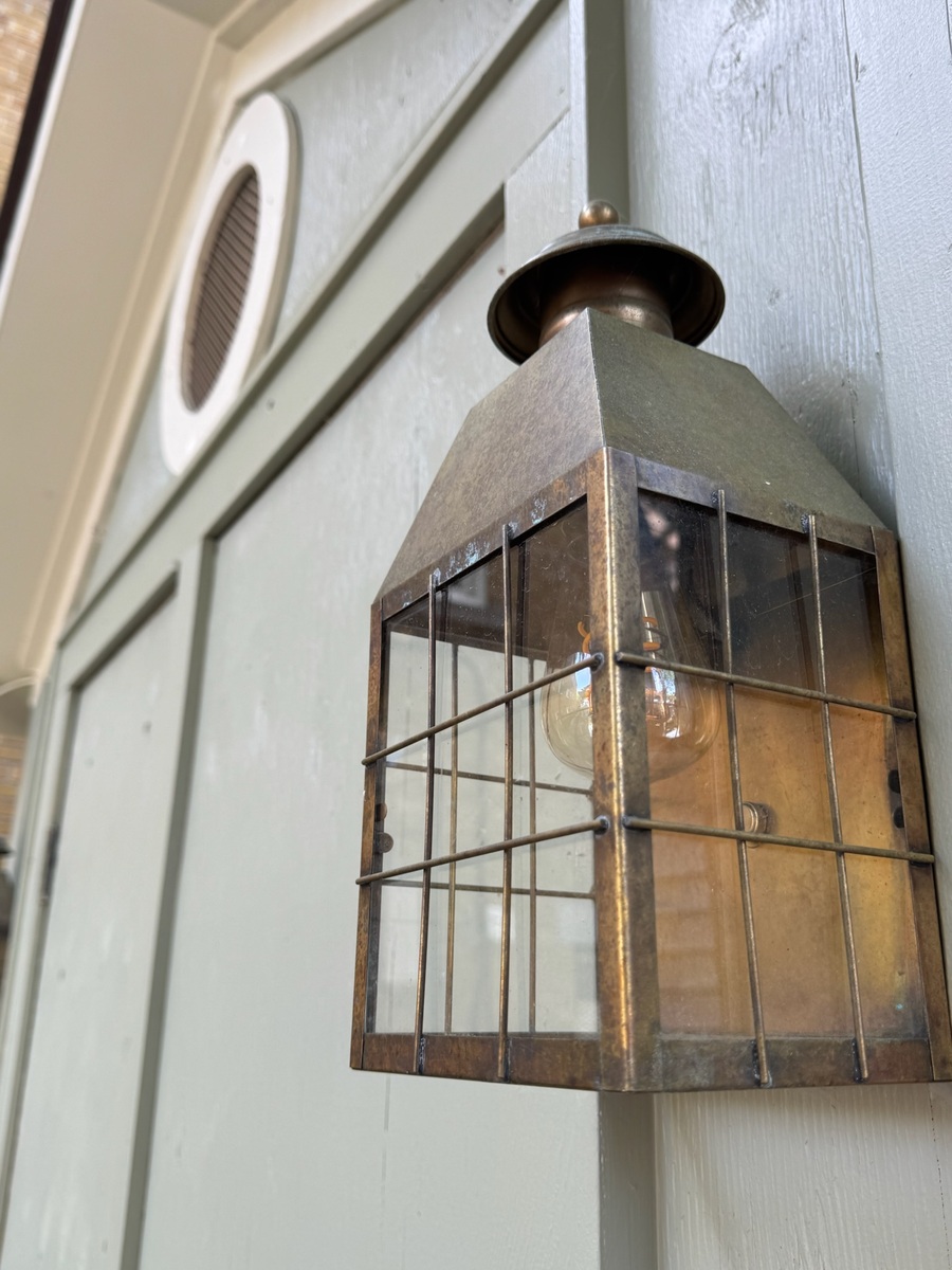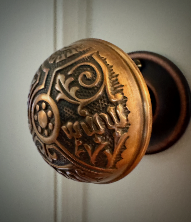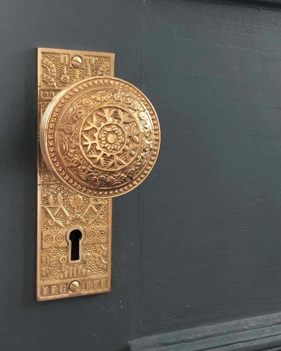 Restoration and re-creation lives in the smallest gestures - a rewired Art Deco–era slag glass pendant light, a restored Victorian-revival lantern, a c.1880 reproduction of an Eastlake-style cast-brass door knob, a restored Eastlake-style door knob, a fateful copy of a 1880s Eastlake-style hinge and sawn brackets reproduced by CNC. Together, they add depth without noise.